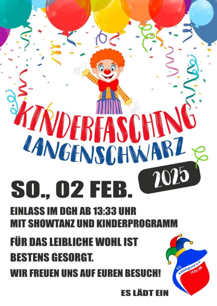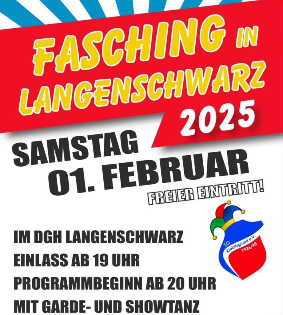 Die SG Kiebitzgrund lädt am ersten Februarwochenende herzlich zu zwei Faschingstagen im Dorfgemeinschaftshaus Langenschwarz ein!