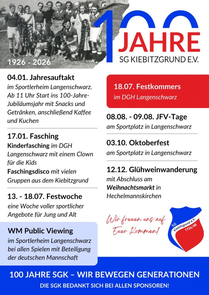 Die SG Kiebitzgrund feiert im Jahr 2026 ihr 100-jähriges Bestehen. Den Auftakt zum Jubiläumsjahr bildet ein Jahresempfang am Sonntag, 04. Januar, ab 11:00 Uhr im Sportlerheim Langenschwarz. Für Snacks und Getränke ist gesorgt, im Anschluss gibt es Kaffee und Kuchen. Alle Mitglieder, Freunde und Gönner sind hierzu herzlich eingeladen. Der Verein freut sich auf zahlreiche Besucher.